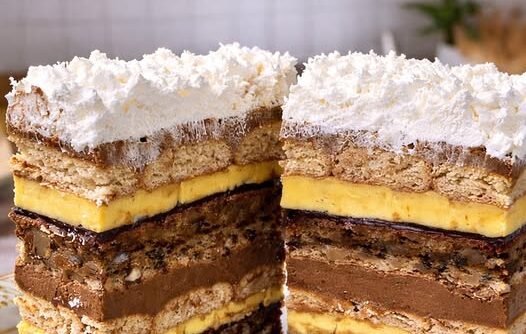 Ova torta je prava slojevita čarolija – bogata, kremasta i puna ukusa, a potpuno posna, bez mleka i jaja. Svaki sloj daje poseban doživljaj, a zajedno čine desert koji izgleda kao iz najlepše poslastičarnice.