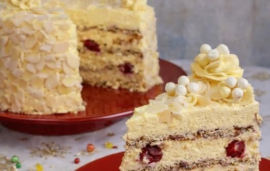 Spolja tortu premazati umućenom slatkom pavlakom i obložiti listićima badema ili belom čokoladom.