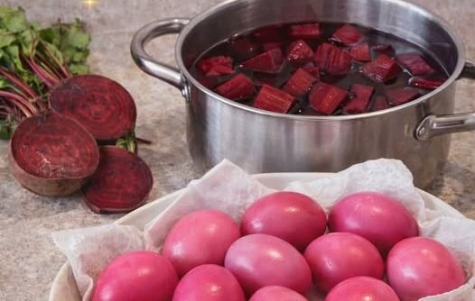 Priprema počinje tako što se cvekla oljušti i iseče na kockice, pa se stavi u šerpu sa vodom. Kuvajte je oko 15–20 minuta kako bi pustila intenzivnu boju. Kada voda dobije tamnocrvenu nijansu, dodaje se sirće koje pomaže da se boja bolje veže za ljusku jajeta.