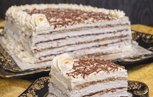 Za završni izgled pospite čokoladne mrvice ili rendanu čokoladu preko torte, a po želji možete napraviti i ružice od šlaga kao na slici. Tortu obavezno ostavite u frižideru minimum 3–4 sata, a idealno preko noći, kako bi se svi slojevi lepo povezali i omekšali. Ova torta je savršeno izbalansirana — kore su lagane i blago orašaste, dok je fil kremast i bogat, ali ne težak. Idealna je za svaku priliku, od porodičnih okupljanja do slavlja, jer izgleda elegantno, a ukus joj je klasičan i svima omiljen.