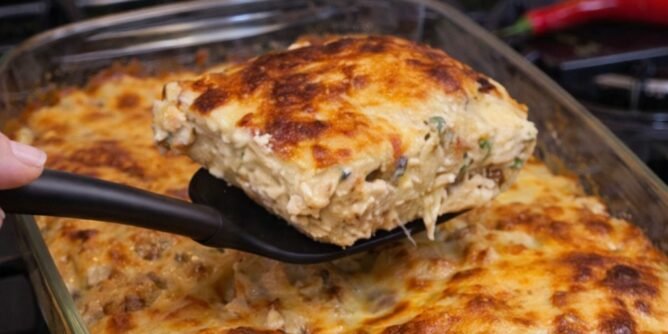 Peče se u unapred zagrejanoj rerni na 200°C oko 25–30 minuta, dok se na vrhu ne stvori zapečena, rumena korica. Kada se izvadi iz rerne, ostavite da odstoji nekoliko minuta da se lagano stegne, a zatim služite dok je još toplo – sočno, kremasto i neodoljivo jelo koje nestaje sa stola za tren.
