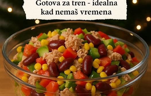 U velikoj činiji spojiti tunjevinu, pasulj, kukuruz i povrće.