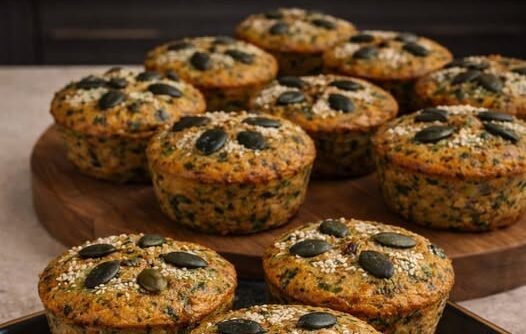 Smesu sipati u podmazan pleh ili kalupe za mafine (kao na slici), pa odozgo posuti susamom ili semenkama bundeve. Peći u prethodno zagrejanoj rerni na 180°C oko 25–30 minuta, dok lepo ne porumeni i dobije zlatnu koricu.