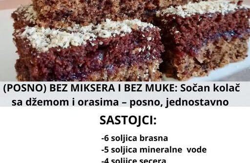 Ovaj kolač je pravi spas kada želite nešto brzo, jeftino i sigurno ukusno, a da ne koristite mikser niti komplikovane tehnike. Idealan je za dane posta, jer je potpuno posan, a zahvaljujući džemu i orasima ostaje neverovatno sočan i mekan danima. Pravi se od sastojaka koje gotovo svaka kuća već ima, pa je savršen izbor kada vam treba brz desert bez puno razmišljanja.