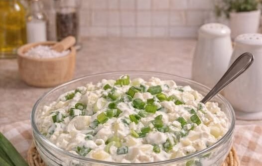 Ova jednostavna i osvežavajuća salata pravi se brzo, a idealna je kao prilog uz razna jela ili kao lagani obrok. Kremasta tekstura i blagi ukus mladog luka daju savršen balans, a priprema je toliko laka da uspeva svaki put.